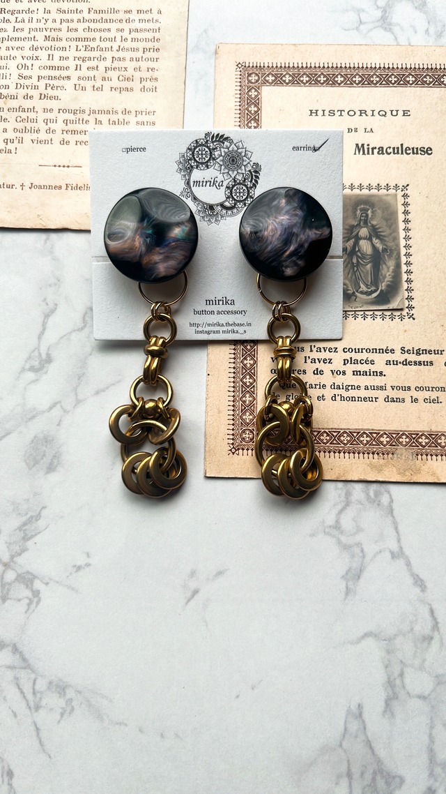 ニュアンスカラーが綺麗なボタン。 合わせた真鍮チャームは少し重めですが、イヤリングなのでしっかり着けていただけます。 チャーム取り外し可能な2way。 金具はチョウバネイヤリングです。 全長約7.5センチ