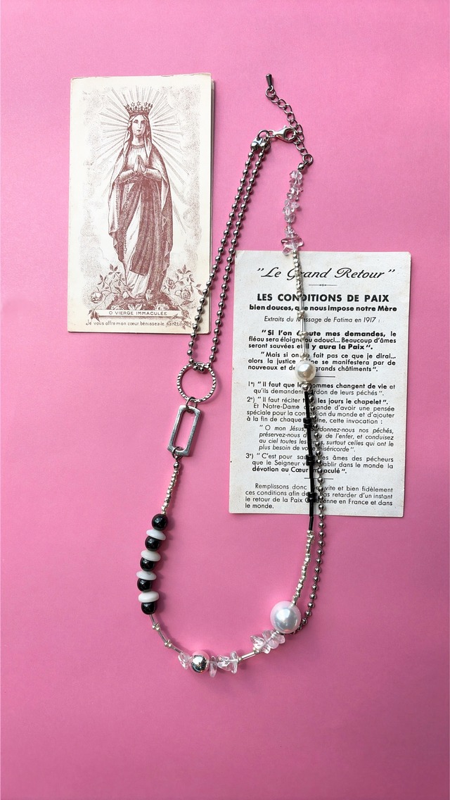 水晶をメインにビンテージビーズや淡水パール、天然石を合わせたネックレス。 チェーン、金具はステンレスです。 全長約54センチ
