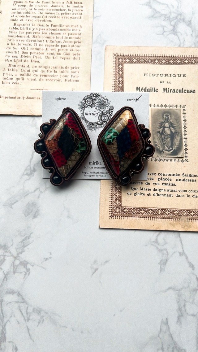 ビンテージのイヤリングをリメイクしたソウタシエ。 ツギハギみたいなデザインのカボションが印象的です。 金具はチョウバネイヤリング。 全長約4.5センチ