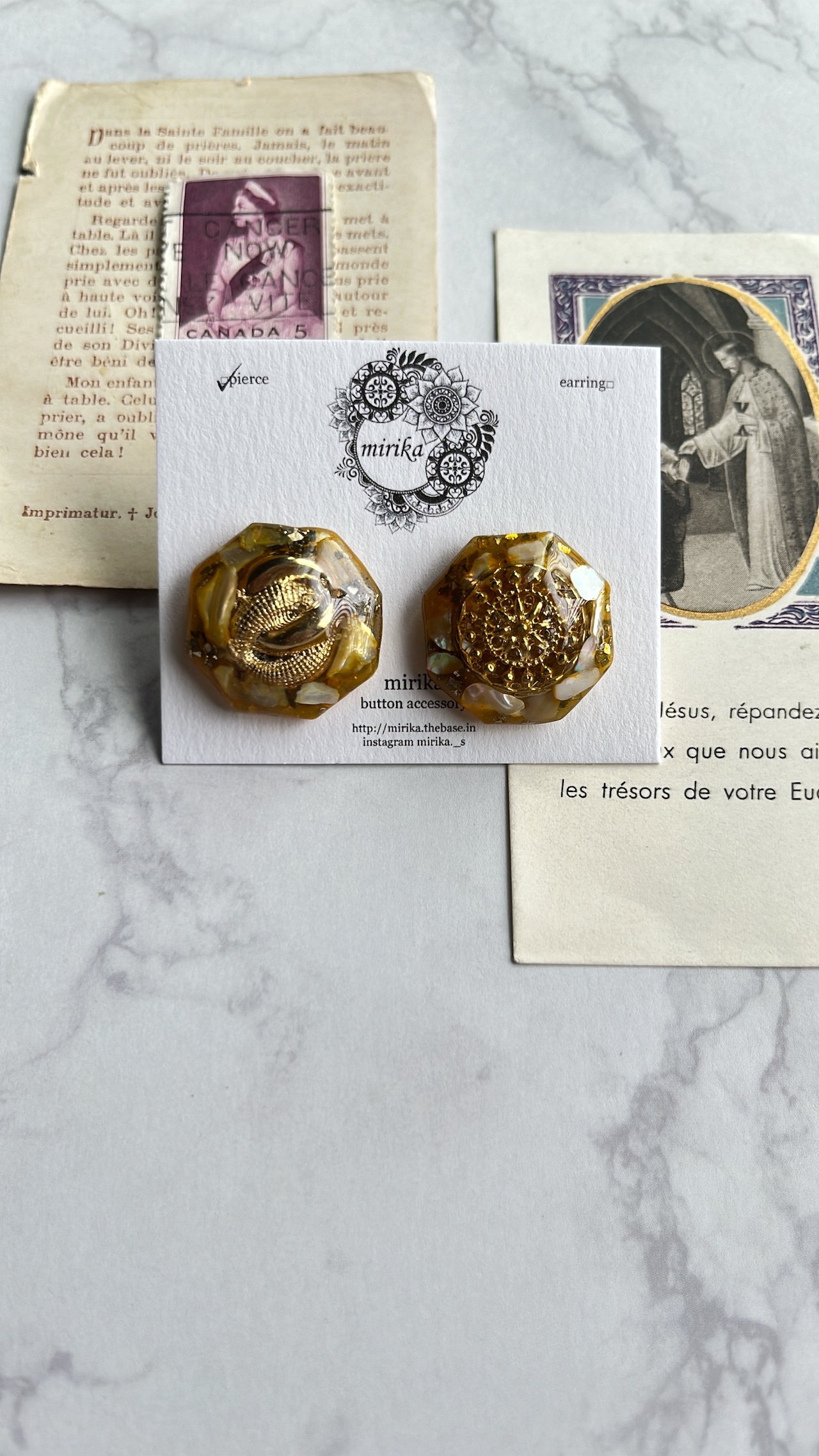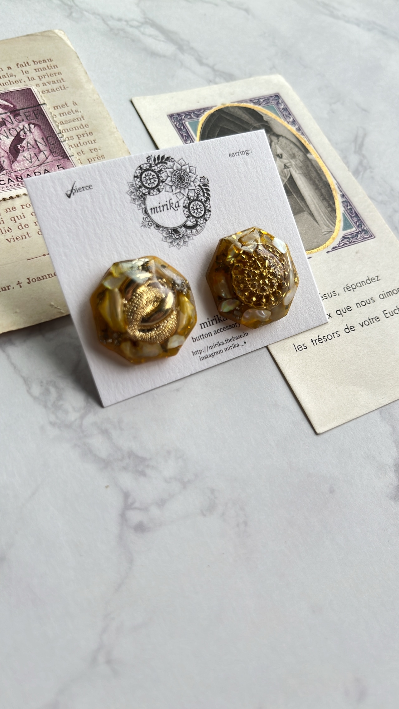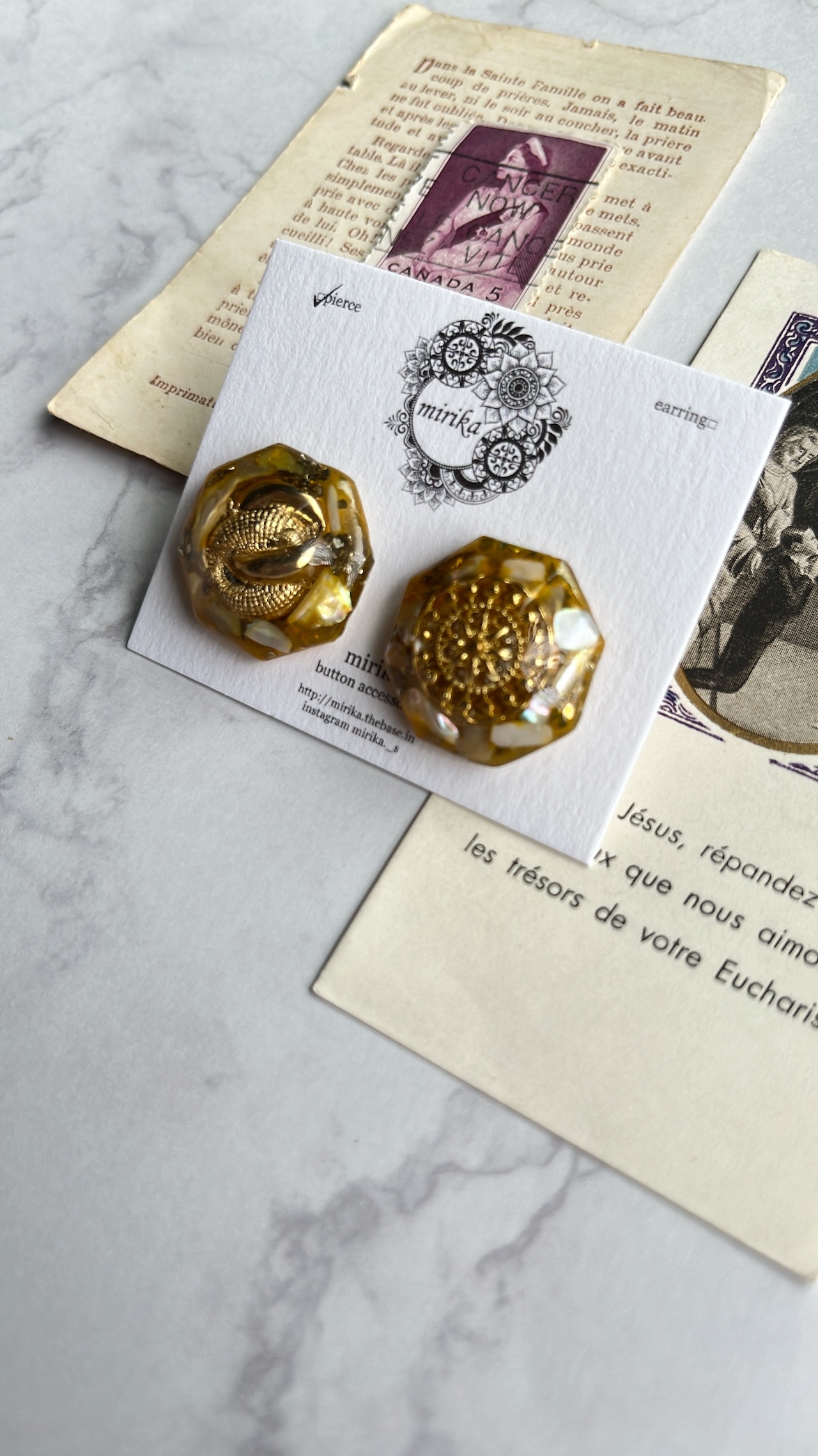 ボタンやシェルをレジンで閉じ込めたピアス。