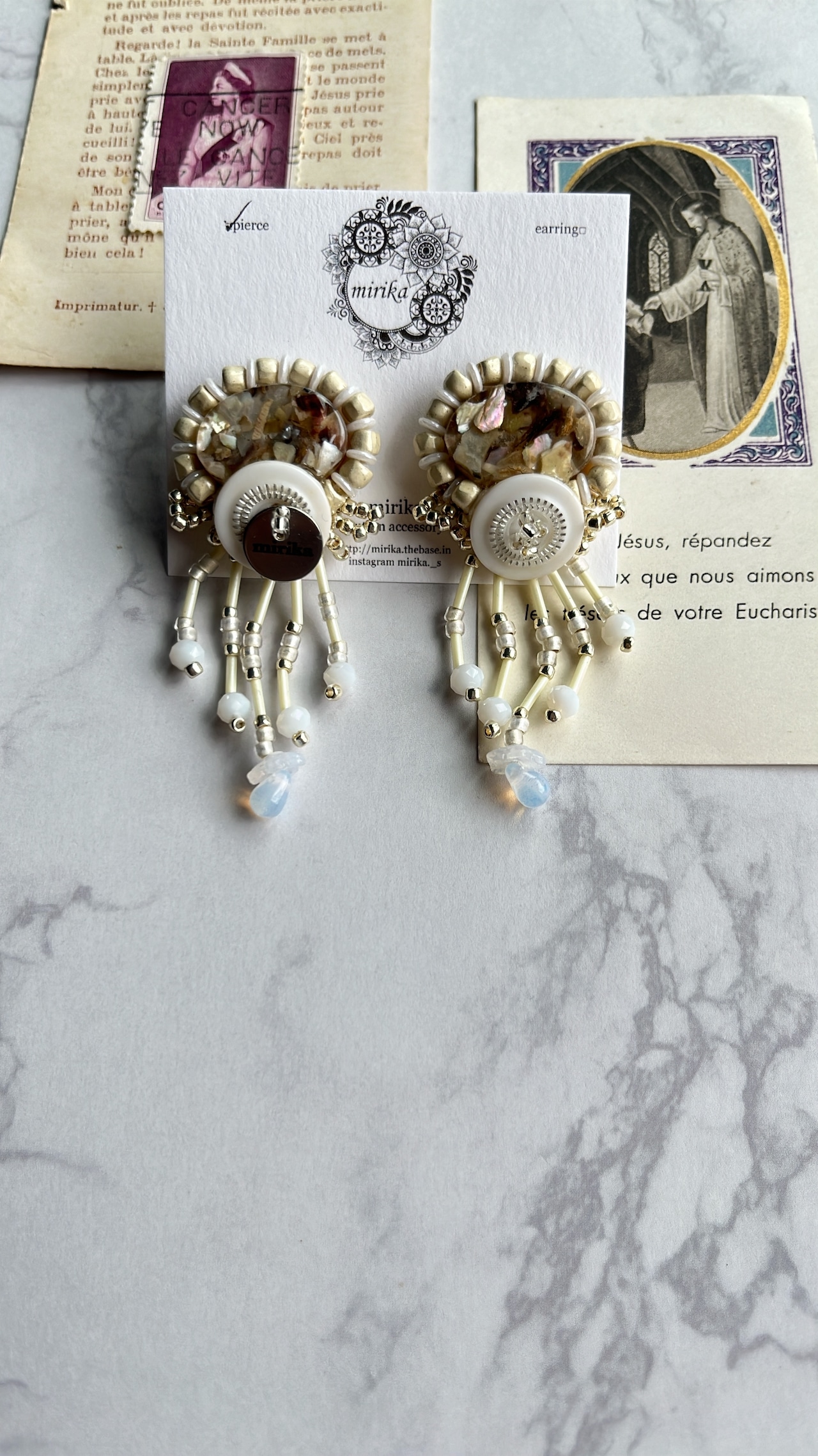 シェルビーズをボタンやビーズで飾り付けたピアス。