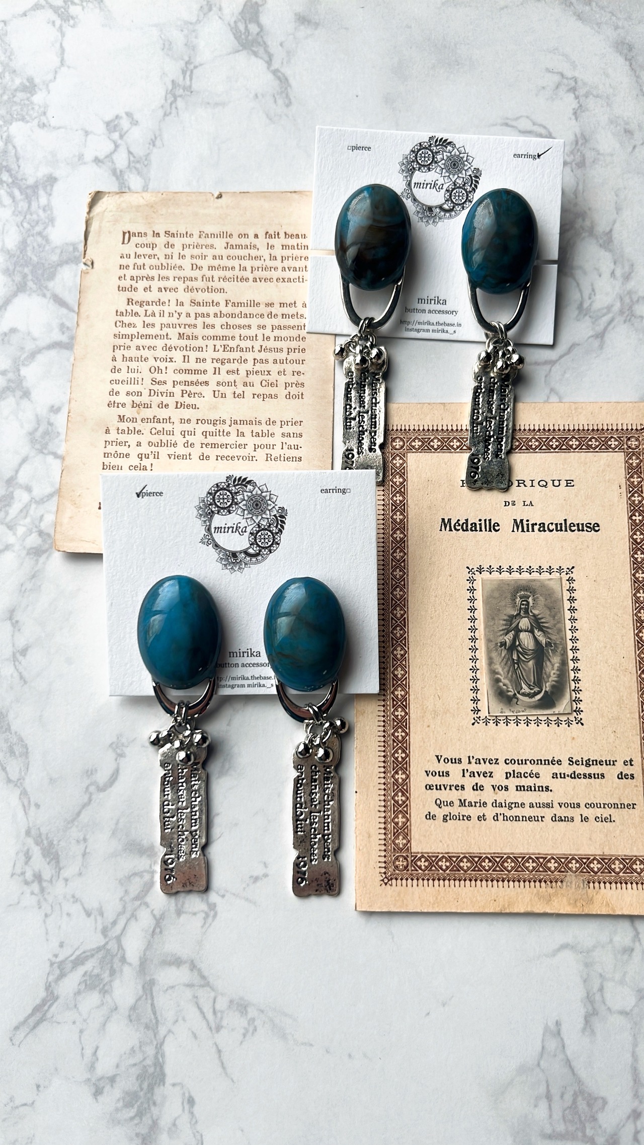 ブルーベースにブラウンのマーブルカボションのピアスとイヤリング。