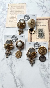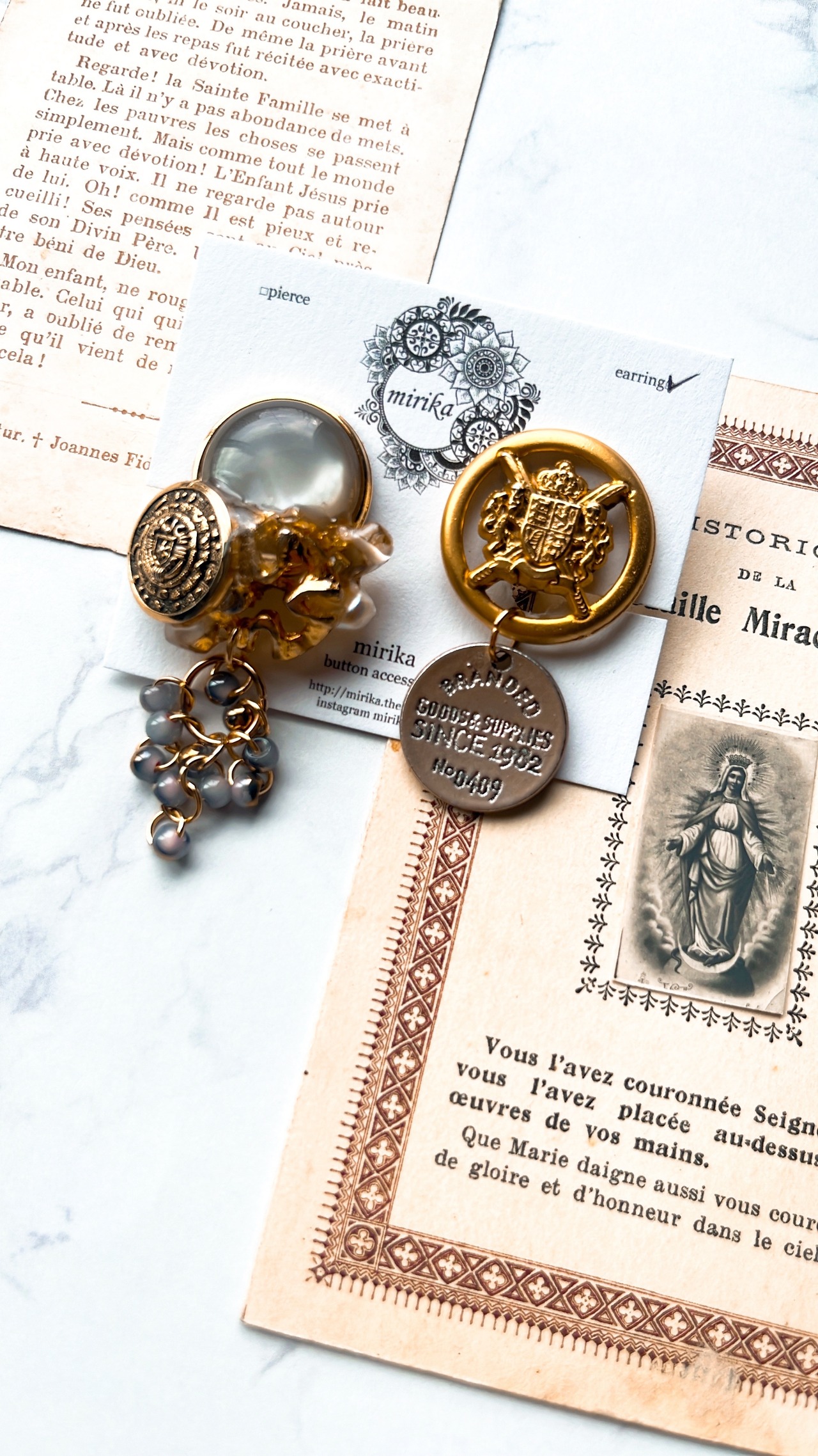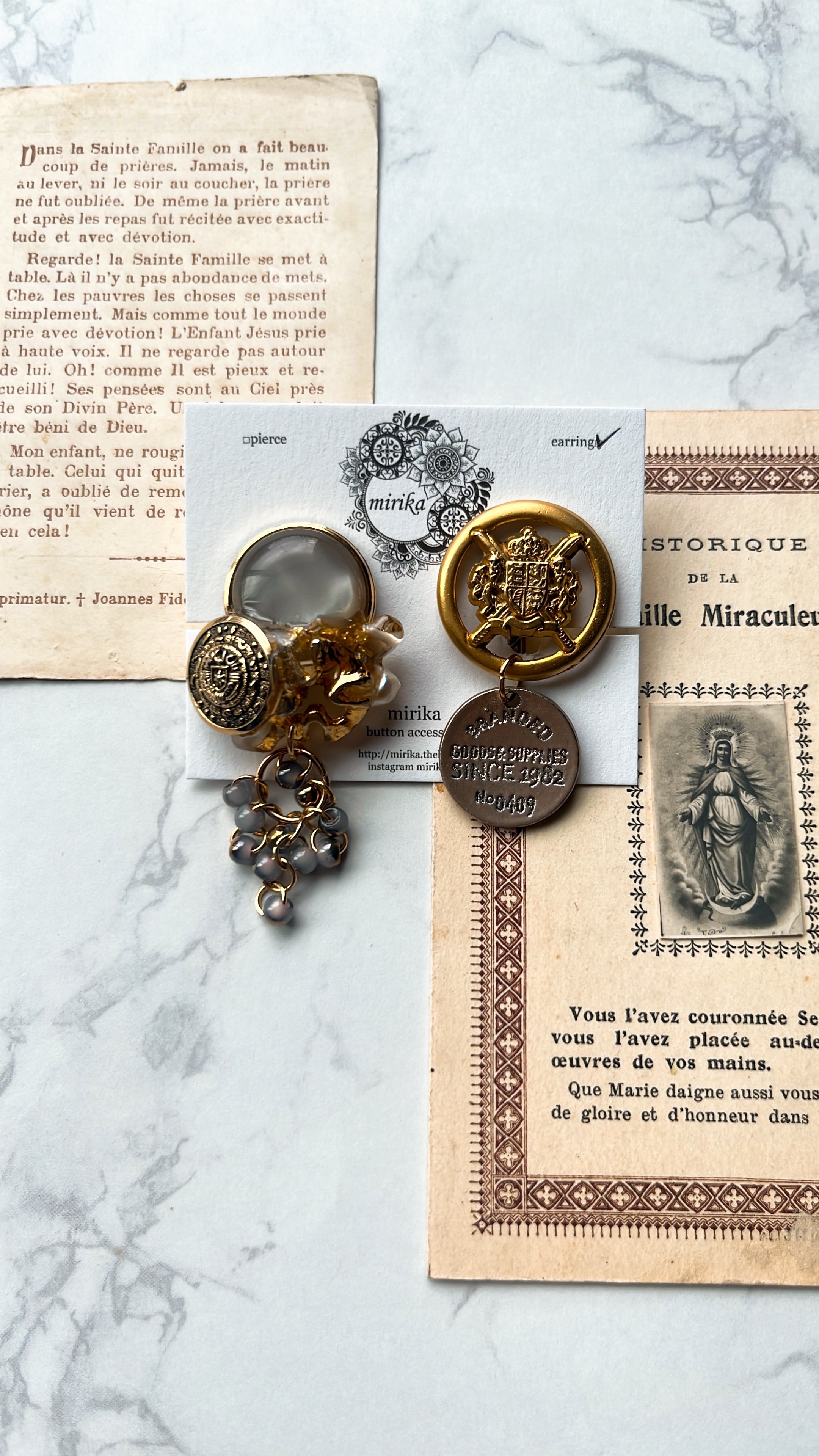 うるっとしたボタンをメインにミニボタンや淡水パール、天然石を飾り付けたデザイン。